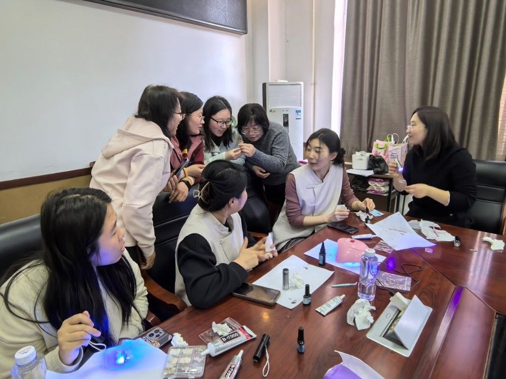 特邀非遗传承人现场指导,女教职工们兴致盎然,认真学习螺钿选材、拼贴、抛光等技法。指尖流转间,素色贝壳化作繁花、锦鲤等灵动图案,现场赞叹声与欢笑声此起彼伏。