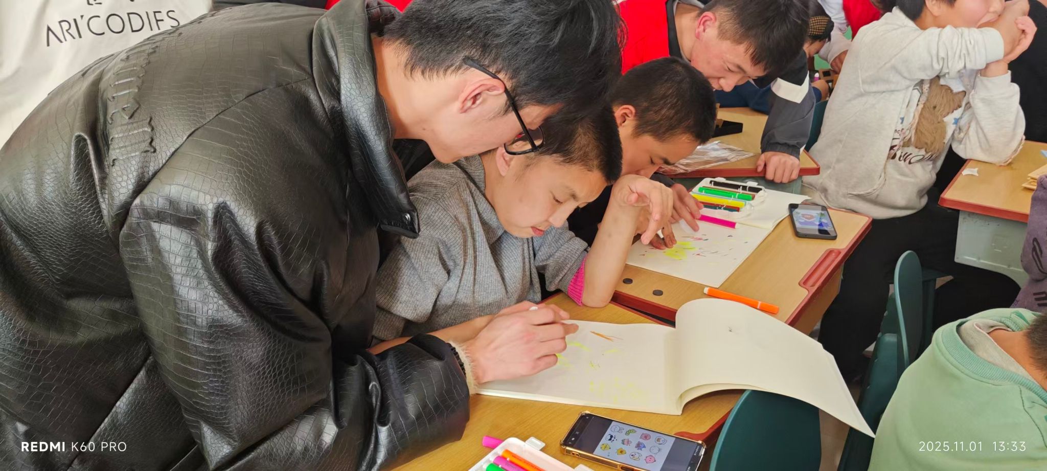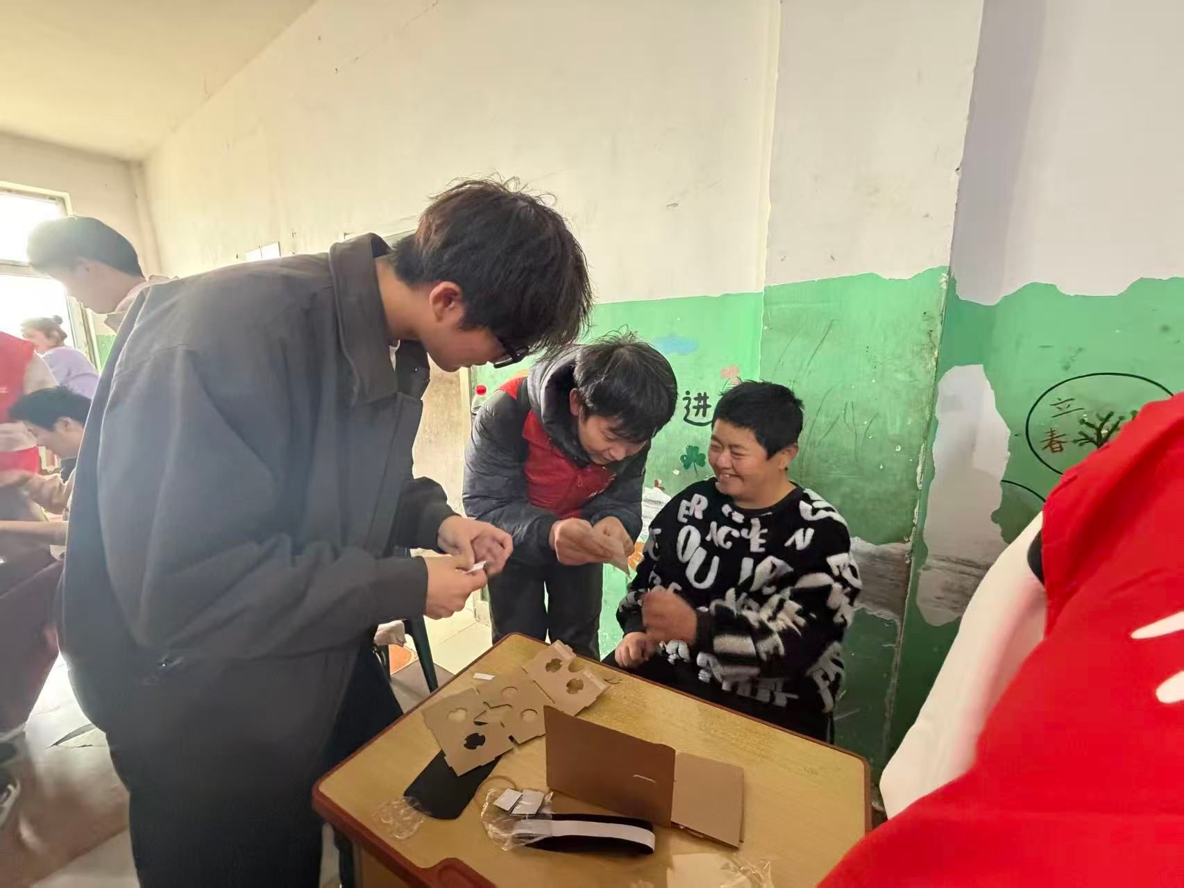 活动现场,志愿者们与特殊儿童亲切互动,精心组织了手工制作、绘画等丰富多彩的体验活动。手工环节中,志愿者耐心指导孩子们组装简易VR眼镜,带领他们“沉浸式”感受科技的奇妙魅力;绘画活动里,大家携手创作,用五彩画笔勾勒出充满童趣的美好画卷,现场始终洋溢着欢声笑语。此外,志愿者们还与孩子们围坐一堂,认真聆听爱心机构负责人分享特殊儿童的成长故事,深入走进他们的内心世界。