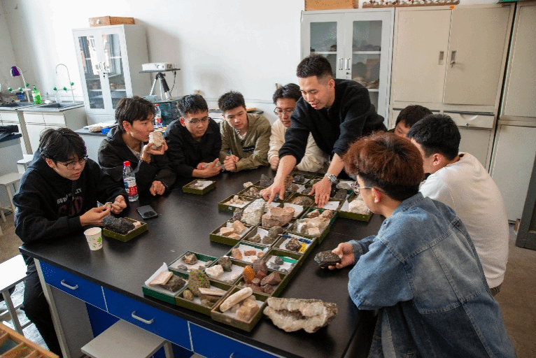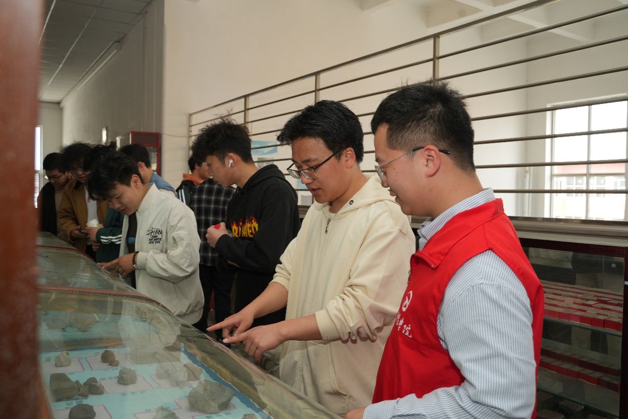 随后,参观队伍移步至致远楼404室的地质实验中心标本实验室。这里珍藏着800余件岩石、矿物及古生物标本,还有1000余片岩石薄片,是认识地球物质组成的天然实践课堂。