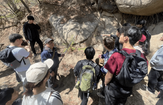 师生们沿登山步道拾级而上,对沿途出露的岩体进行了实测与观察。同学们以班级为单位,分组对花岗岩的矿物组成、结构构造及侵入接触关系进行记录。随行教师结合岩体中发育的节理与裂隙,现场讲解了“差异风化”和“球状风化”对地貌的塑造作用,将《普通地质学》中抽象生硬的理论知识转化为实景教学内容,实现理论与野外实践深度融合。