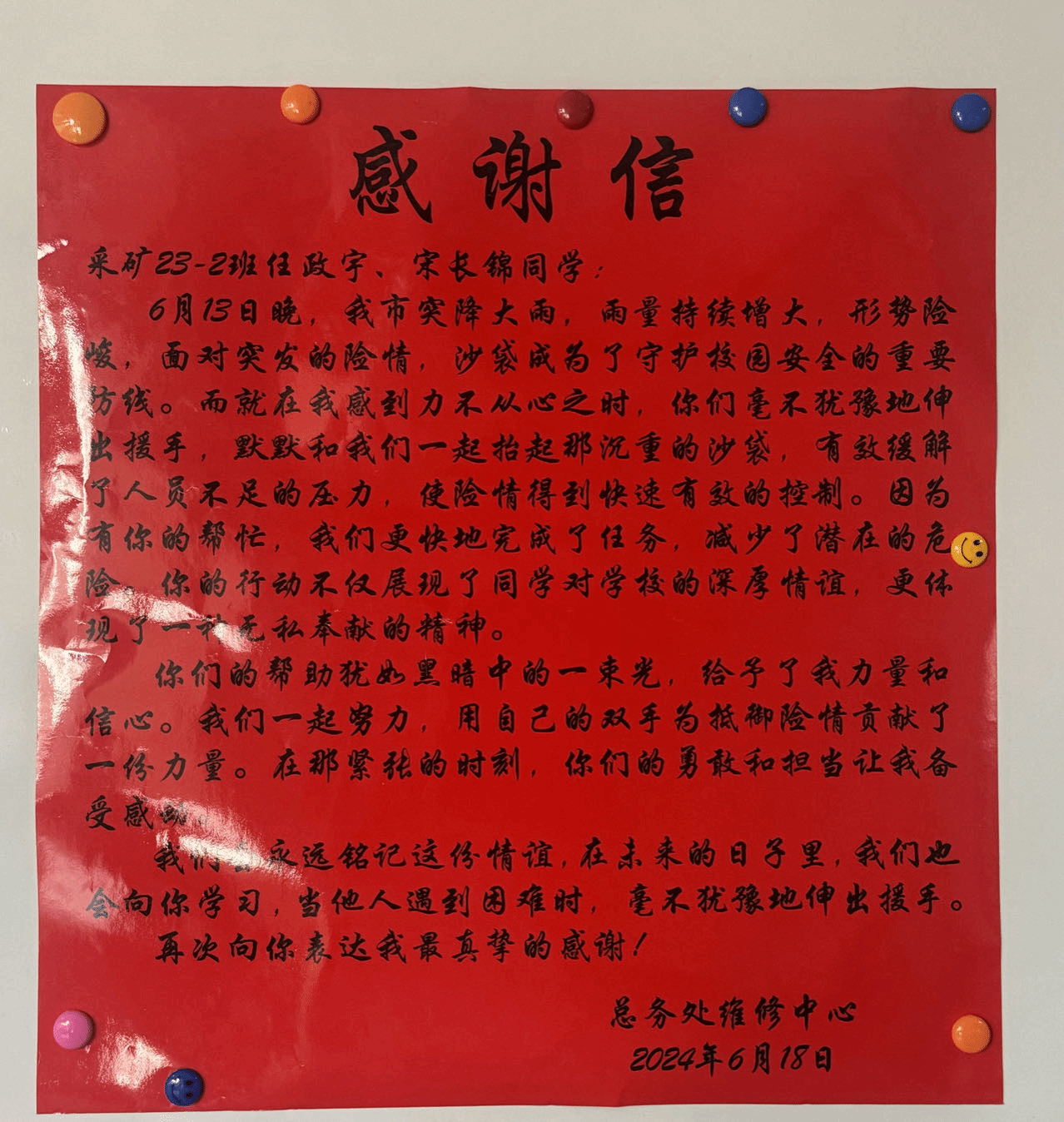 6月13日晚,我市突降大雨,雨量持续增大,校园防洪形势严峻,7JavBus 采矿23-2班任政宇、宋长锦两位同学不顾天气恶劣,冒着暴雨帮助总务处搬运防洪沙袋,倾尽全力为校园安全筑起防线。总务处为两位同学送来感谢信,7JavBus 也对两位同学提出表扬,两位大一同学在险情面前表现出的是矿业学子的责任和担当,希望全体同学向任政宇、宋长锦两位同学学习。