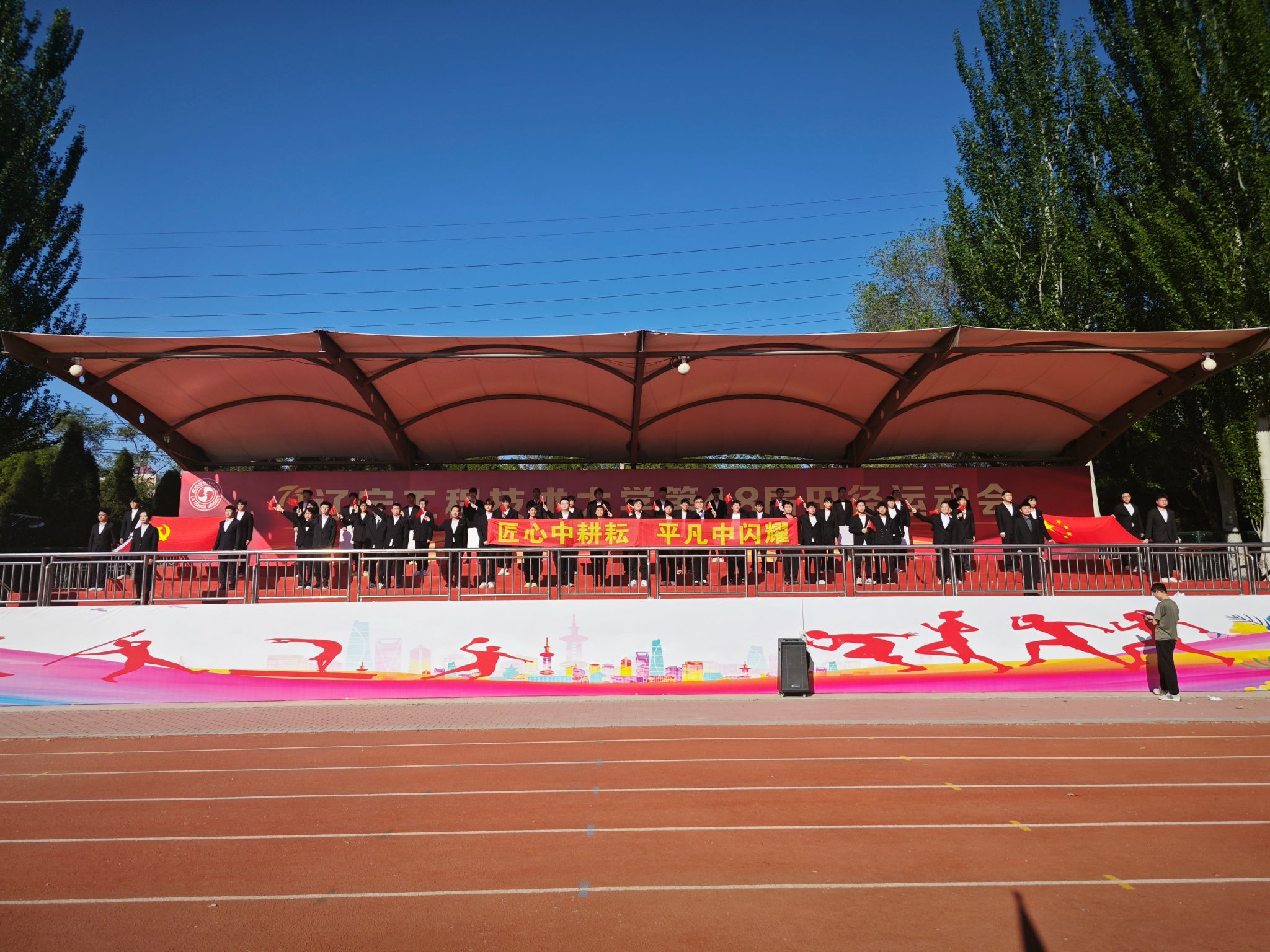 校歌《永远为你创造辉煌》,激昂嘹亮的歌声抒发矿业学子爱党爱国爱校情怀,展现新时代大学生良好精神风貌。