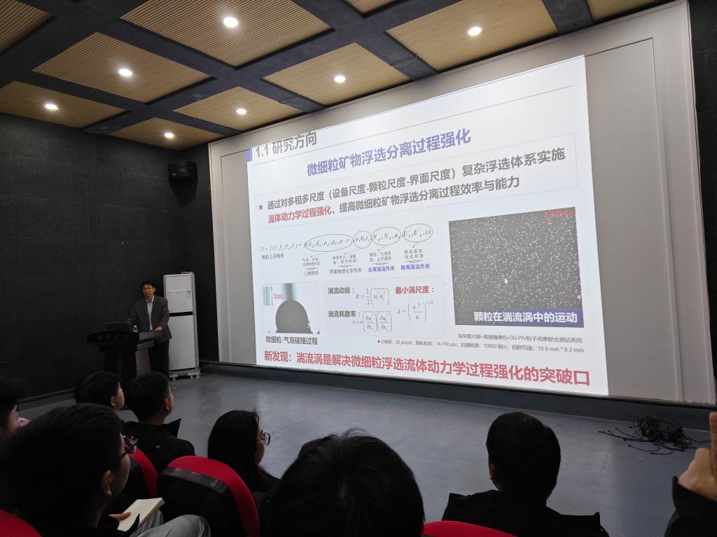 ,为矿物加工工程系师生作名称为“微细粒矿物浮选分离流体动力学过程强化”学科前沿学术报告。报告持续70余分钟,从微观尺度上阐释了微细粒矿物浮选分离流体动力学,让师生们感受到了科研的魅力,深受震撼、收获巨大。