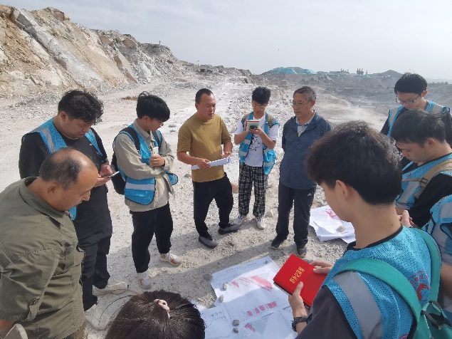 2023年9月18日上午,在五队张海峰、李修文高工的带领下来到大石桥市青山怀超大型菱镁矿开展矿床考察。期间张海峰高工向同学们介绍了菱镁矿的成因、产状,以及不同工业品位矿石的特征。同学们积极记录,请教,并采集了部分矿石标本。