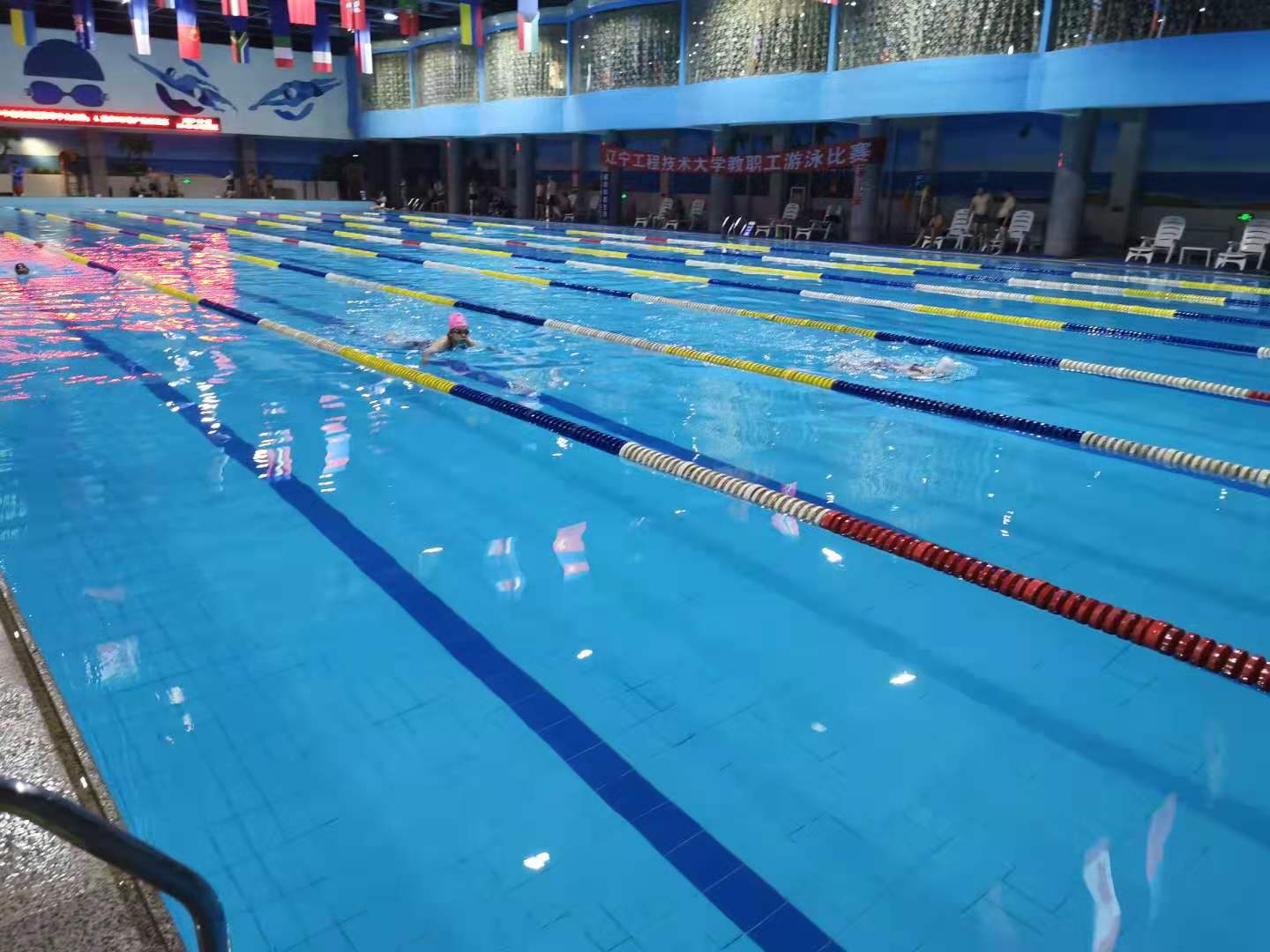 阜新校区首届教职工游泳比赛,比赛场地设定在阜新市星光宾馆游泳馆。比赛分男子组50 m蛙泳、50m自由泳、100m蛙泳、女子组50 m蛙泳、50m自由泳、100m蛙泳、男子组混合泳姿 4*50 m接力赛及集龙珠趣味比赛等。