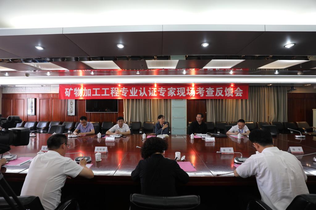 在国际会议中心召开矿物加工工程专业认证专家现场考查反馈会。专家组组长东北大学魏德洲教授、安徽理工大学朱金波教授、中国矿业联合会陶明炬教授、武汉工程大学何东升教授、三峡大学周祥曼副教授参加会议。