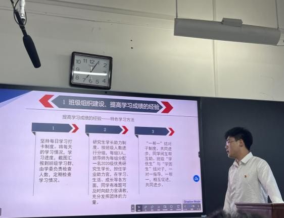 本次会议邀请贺鹏、孔舜秋、赵振兴、荆曌怡四位优秀毕业生党员代表分别围绕学业与科研、就业与职业规划、学生组织与班团建设、考研方法与复试准备4个方面,分享了自己的经验和感悟,同时还设置了交流问答环节,解答了大家的疑惑和困惑。