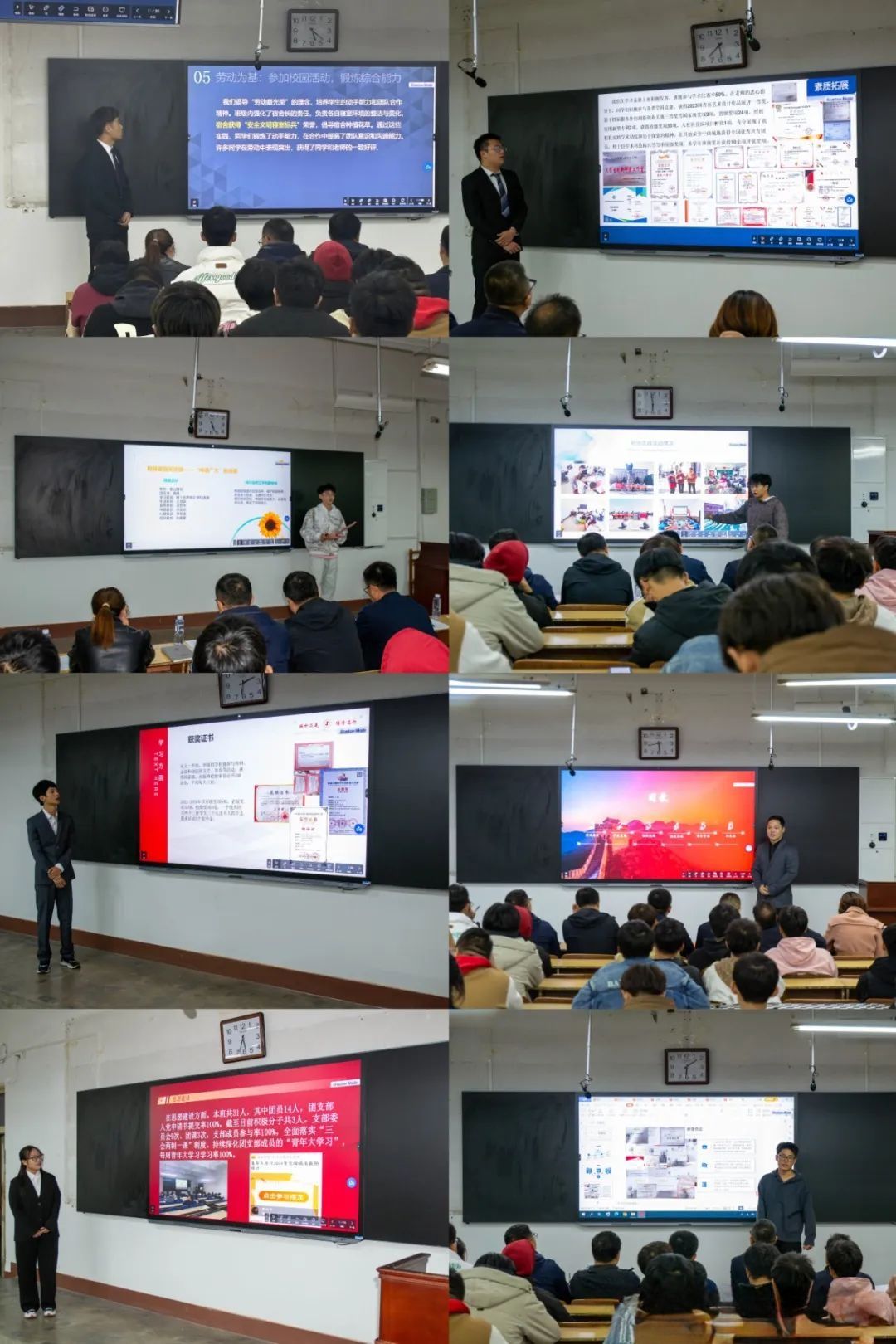审核,共有8个班级进入答辩环节。各班级代表分别从本班学风建设、学业成绩、科技学术活动参与及获奖情况、学业帮辅开展情况等8个方面进行介绍。答辩选手的现场表现获得了各位评委的认可和现场观众的掌声,通过现场交流,各班级相互借鉴、共同学习。