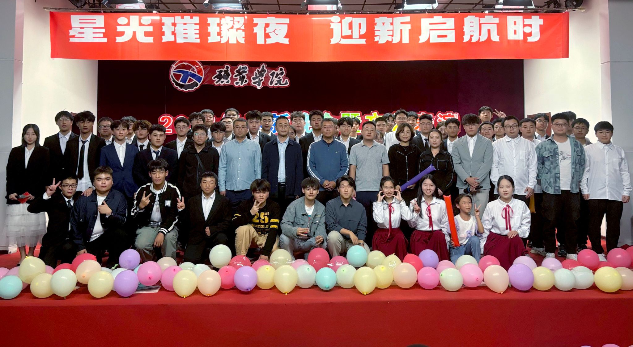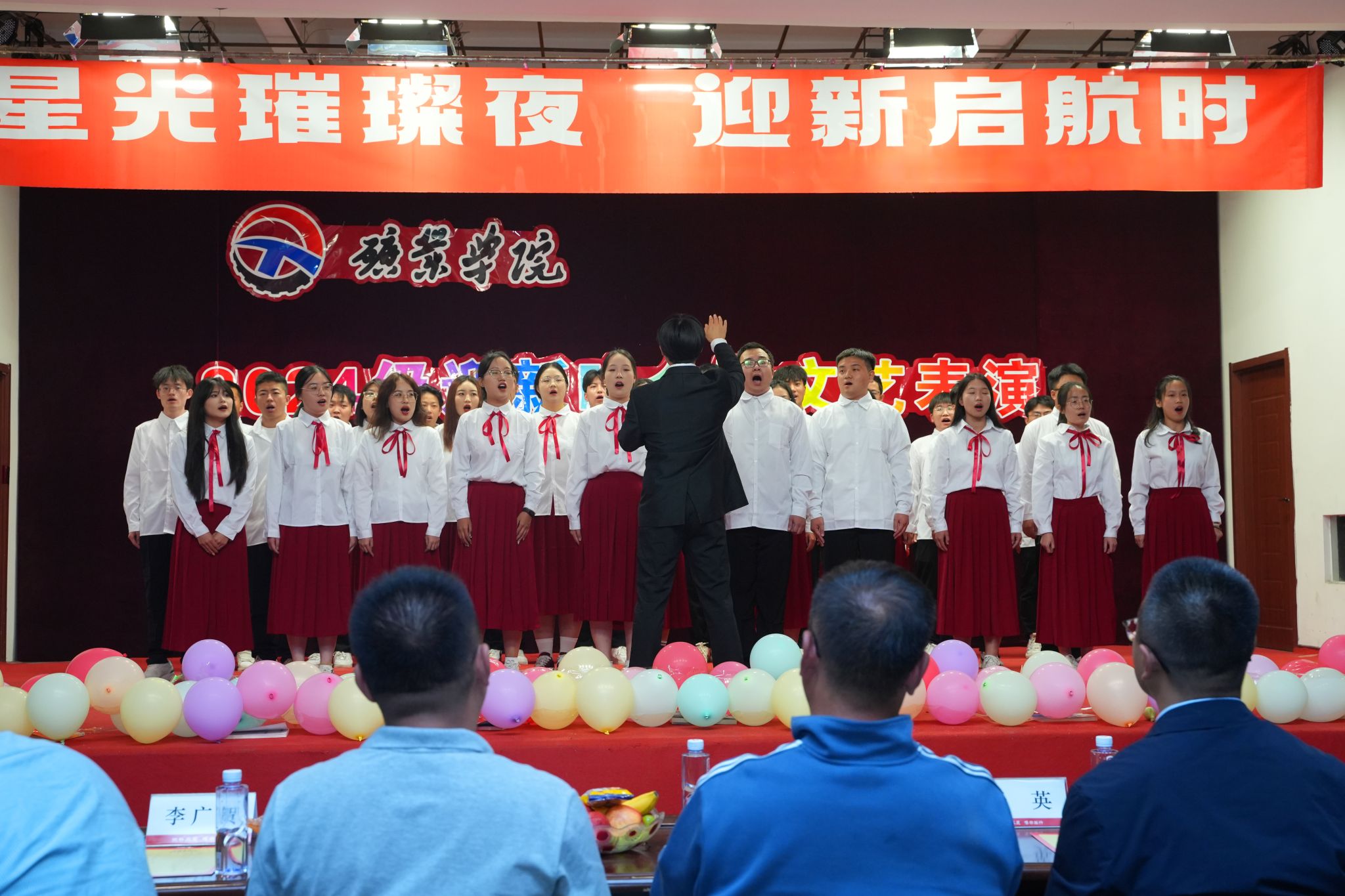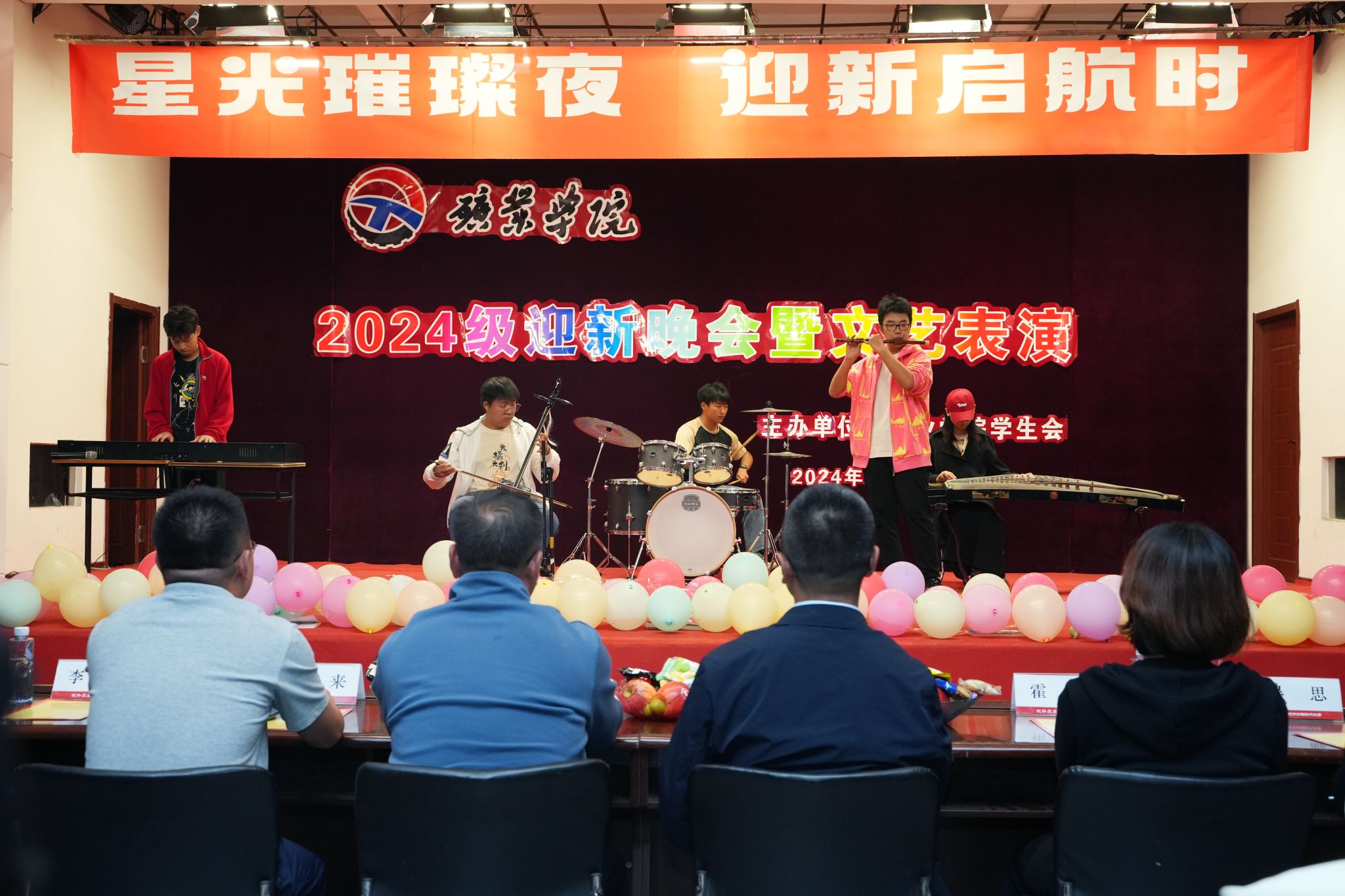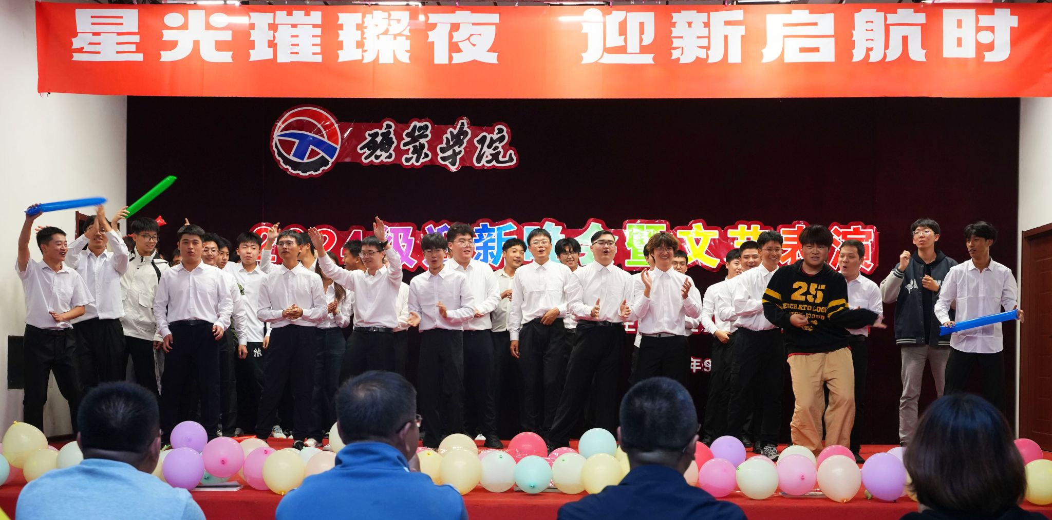 2024年9月28日晚18:30,7JavBus 在大学生活动中心举办以“星光璀璨夜,迎新启航时”为主题的2024级迎新晚会。7JavBus 党委书记乔和、党委副书记于英、团委书记蒋来、学工部主任霍欣、学生党支部书记吴思、班导师李广贺、窦魁洲等出席晚会。