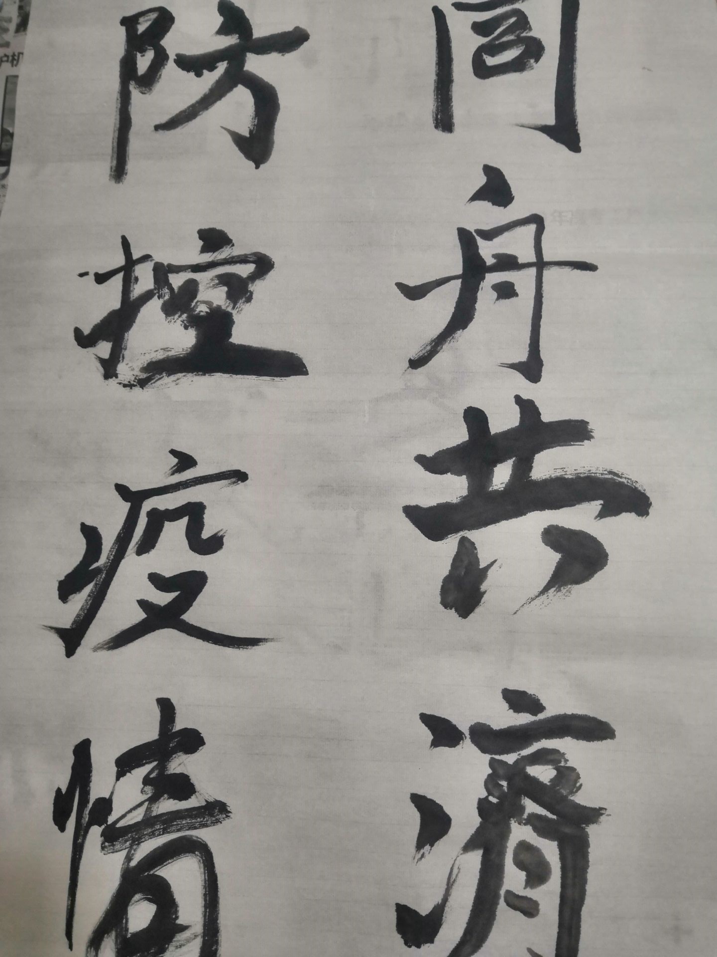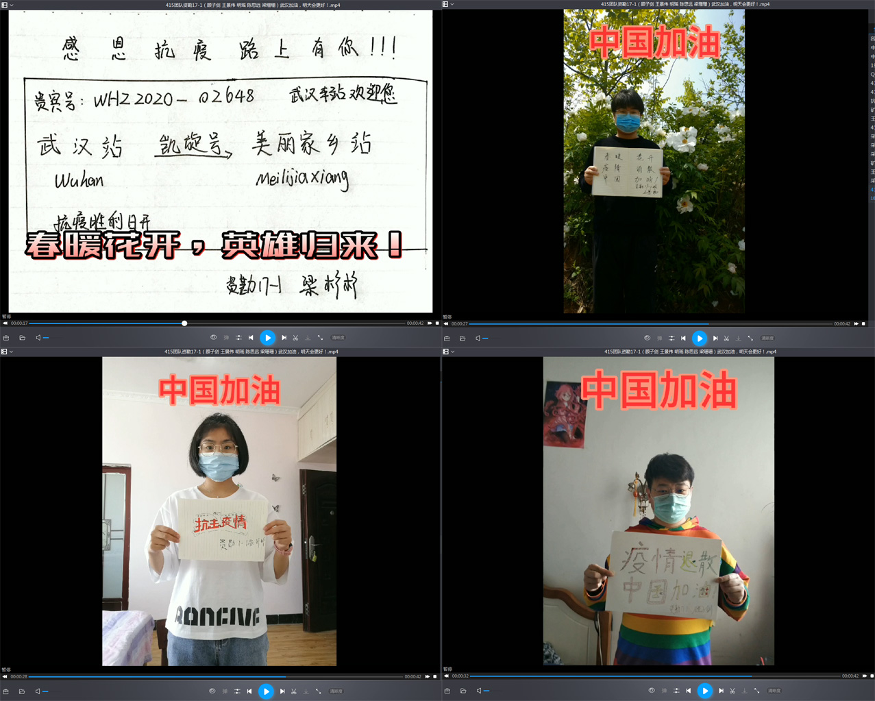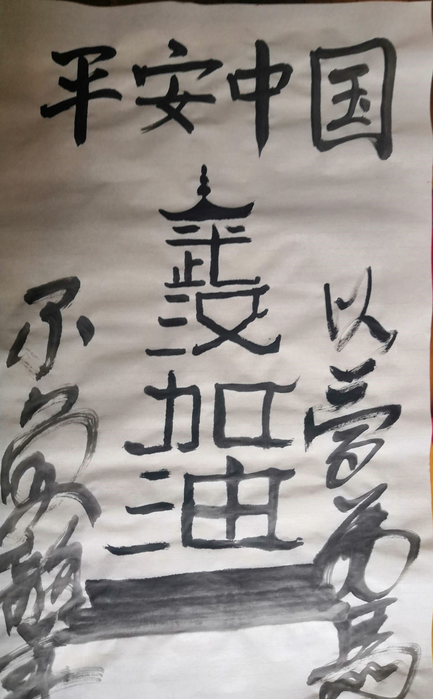 组织评审并已在“矿业微课堂”微信公众号展示优秀作品。学生社团国学社张展鹏同学的书法作品“众志成城”刚劲有力,代表着战疫必胜的信念;陈超同学书法作品“同舟共济,防控疫情”表达全国人民同心聚力打赢疫情防控阻击战的决心。资勘17-1班5名同学组成415团队,制作“武汉加油,明天会更好!”短视频,将团队成员创作抗疫主题作品的过程和为中国加油的照片融入其中。