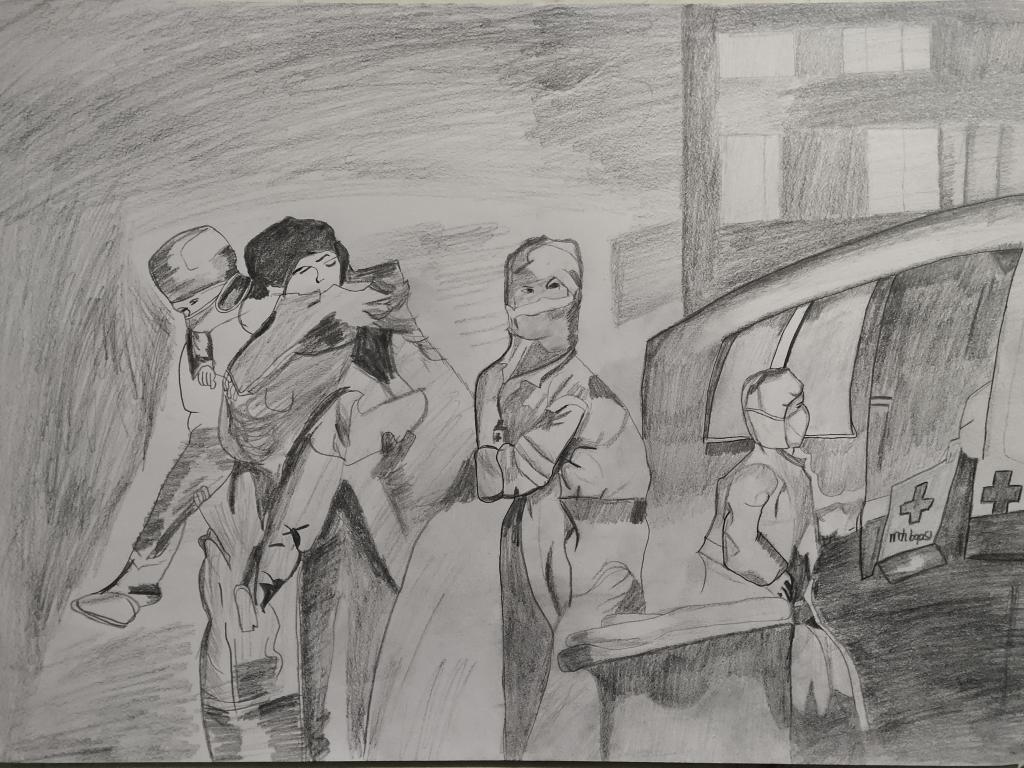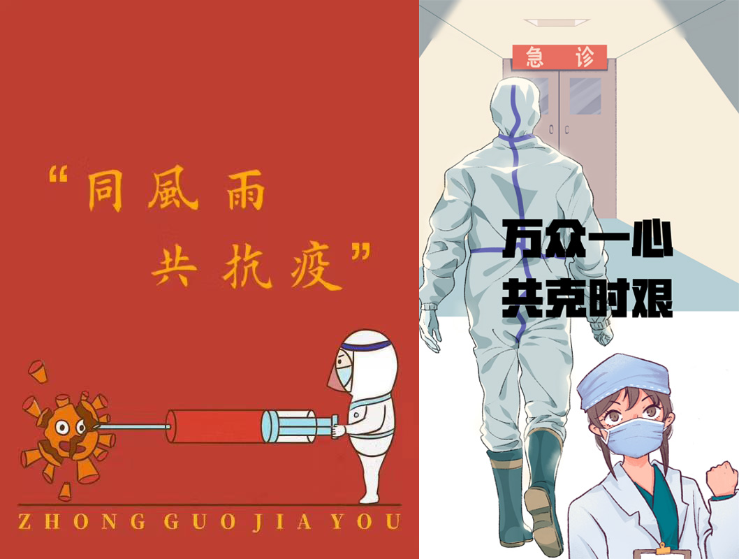 绘画及视觉设计类作品展现抗疫的感人瞬间与磅礴力量,资勘17-1班张坤哲绘制身穿防护服的白衣天使义无反顾地奔向“战场”,资勘19-1班陈可新描绘医护人员全力抢救患者的场景,采矿17-3班邢景超、采矿17-2班王健等同学设计的主题海报将抗疫精神与新媒体平台展示风格相结合。